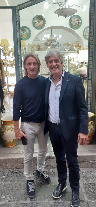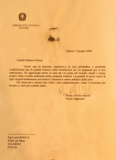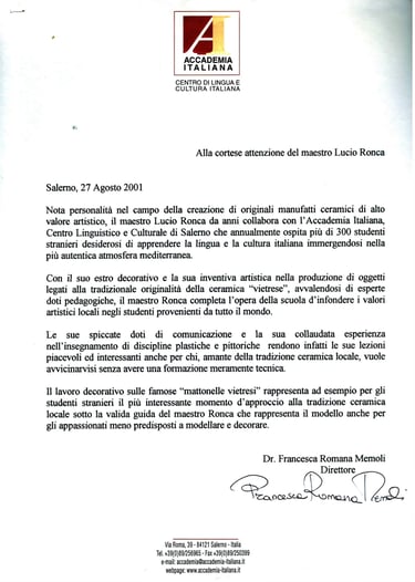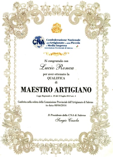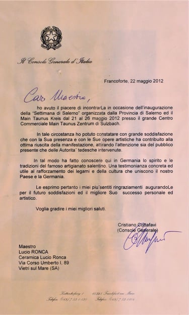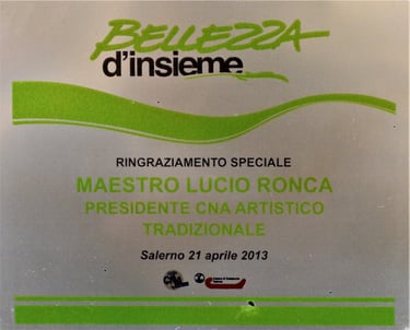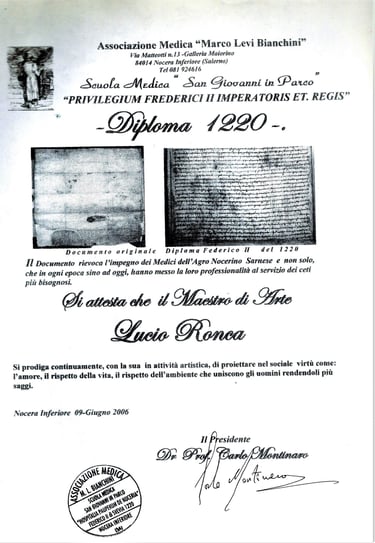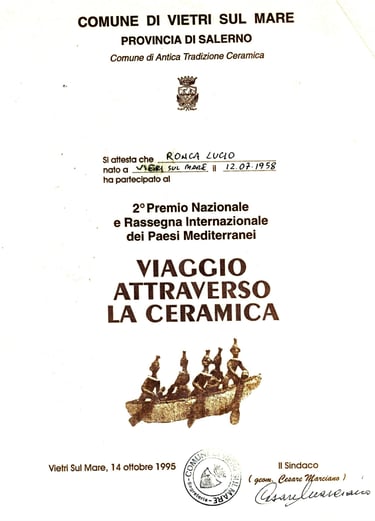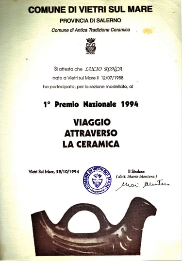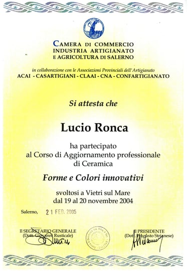Lucio Ronca, nato il 12 luglio 1958, ha iniziato il suo percorso formativo nelle botteghe di Vietri sul Mare, apprendendo le tecniche tradizionali della lavorazione dell’argilla. Nel corso degli anni, ha integrato questi insegnamenti con linguaggi e tecniche contemporanee, dando vita a un percorso artistico che dialoga in modo attento con la tradizione ceramica. La sua produzione, che abbraccia la ceramica, il design, la pittura e la scultura, si caratterizza per una ricerca stilistica costante e l’incontro tra elementi del passato e innovazioni tecniche e cromatiche. Ronca ha partecipato a numerose esposizioni, sia in Italia che all’estero, tra cui la Biennale di Venezia, la Biennale di Palermo, il Milano Art Gallery, mostre a Rouen, a San Paolo in Brasile e presso la Galleria Centrale di New York. Parallelamente all’attività espositiva, l’artista ha svolto un ruolo formativo presso il laboratorio Ceramica Ronca a Vietri sul Mare, contribuendo alla diffusione di tecniche e metodi tradizionali tra studenti di diverse nazionalità. Il percorso di Ronca, che ha avuto inizio fin da giovane quando si cimentava con la modellazione dell’argilla, si è poi consolidato con il diploma conseguito all’Istituto d’Arte di Salerno. Il suo impegno si estende anche a progetti culturali e sociali, come la collaborazione con la Nuova Scuola Medica Salernitana. Nel 2022, il Presidente della Repubblica Sergio Mattarella, insieme a Mario Draghi, ha conferito a Ronca il titolo di Ufficiale al Merito della Repubblica Italiana per l’arte, riconoscendo il contributo apportato al panorama artistico nazionale. Inoltre, Ronca ha ricoperto incarichi istituzionali quali la presidenza provinciale della CNA di Salerno dal 2017 e, nel marzo 2024, quella del Consiglio Regionale Unipol della Campania. La carriera di Lucio Ronca evidenzia una continua esplorazione tra tradizione e modernità, con un impegno costante nel campo artistico, formativo e istituzionale